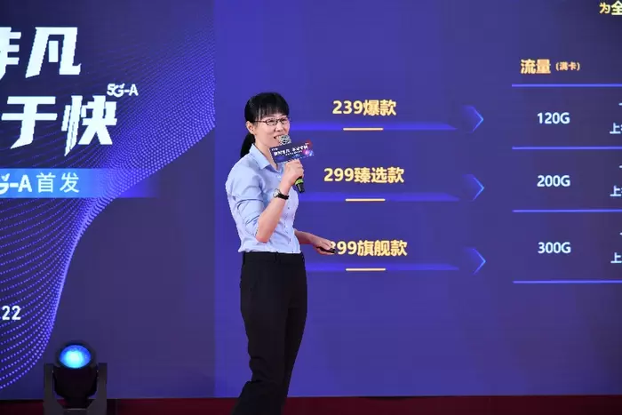 中国电信股份有限公司苏州分公司副总经理曹轶介绍5G-A个人套餐。得益于5G-A超高上下行速率和网络优先保障的特点,电信5G-A套餐适用于出行、直播、游戏和场馆等场景,并叠加应用、靓号、服务等多种权益,此外还提供5G-A场馆包、流量月包的模式,既降低了用户的购买门槛,又凸显了 5G-A 网络的速率权益,有效提升用户体验,以领先的5G-A能力服务苏城百姓。