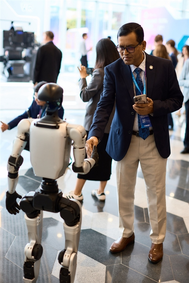 更为新颖的是,机器人首次以“发言人”的身份登上商务论坛舞台。在“城市、人工智能与机器人:迈向混合世界的准备”环节中,类人机器人Ardi分享了其对于未来城市的设想,描绘了人工智能和机器人全面融入城市基础设施的图景。而另一款名为 Avatar的机器人,则通过实时传输人类操作者的情绪与语言,担任起论坛商务环节的虚拟主持人,为现场带来前所未有的互动体验。