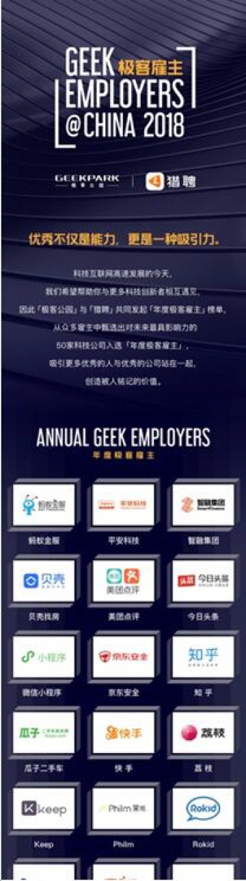 因为只有如此,具备同样开拓力、创造力、改变力,和认知力的人才才会因此而聚拢汇聚;而极客公园和猎聘通过甄选并发布汇聚了这样50家优秀公司的「极客雇主2018」榜单,我们希望,优秀的人与优秀公司的真正高效汇聚将从此开始。