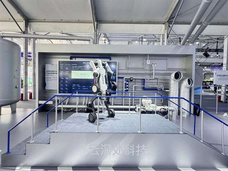 在云栖大会云深处科技展馆内,工作人员 1:1 还原了变电站真实作业场景,绝影 X30 四足机器人现场完整演示了全流程自主巡检作业 —— 从自主导航进入巡检区域,到精准完成数据采集,再到自动生成巡检报告,最后自主返回充电桩补能,全程无人工干预,完美呈现了工业级智能巡检的完整闭环。