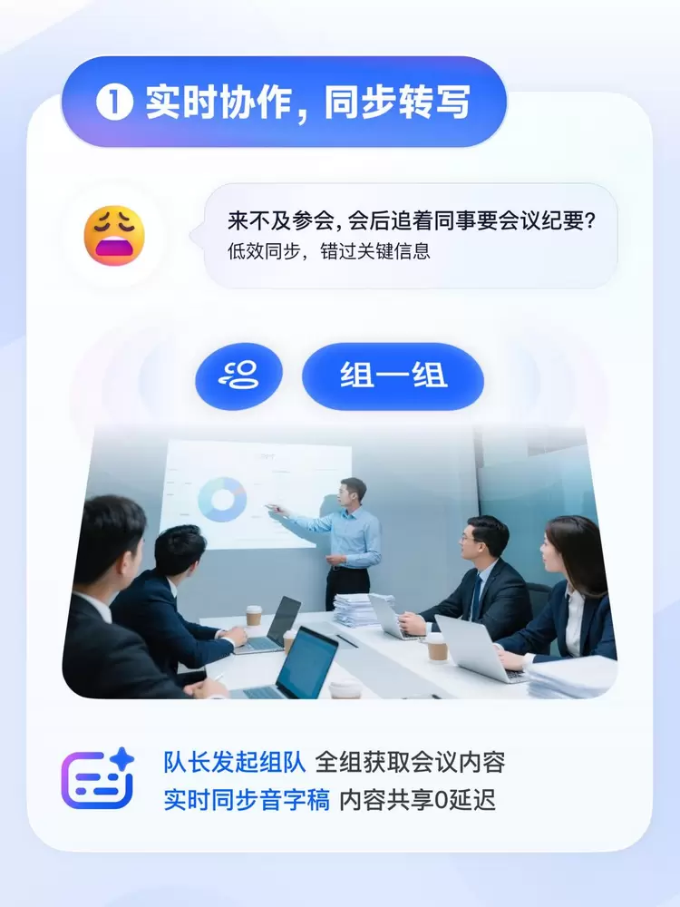 在快节奏的工作场景中,会议是信息传递的重要途径,但常常有人因各种原因无法参会,会后追着同事要会议纪要,不仅效率低下,还容易错过关键信息。讯飞听见「组一组」功能完美解决了这一烦恼。队长在讯飞听见发起组队邀请,小伙伴加入后即可实时共享会议内容,同步生成的音字稿实现内容共享 0 延迟,让每个人都能及时掌握会议核心要点,不再因参会缺席而与重要信息失之交臂。