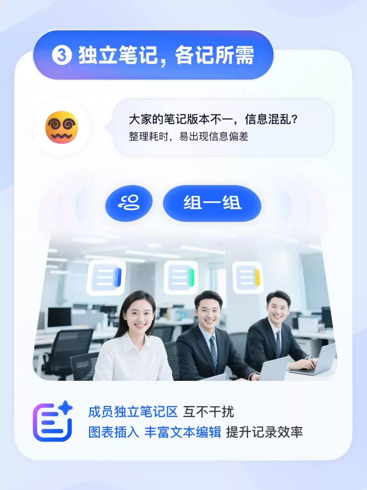 团队协作中,大家的笔记版本不一、信息混乱是常见问题,整理时耗时费力,还易出现信息偏差。讯飞听见「组一组」功能为成员设置了独立笔记区,互不干扰。同时,支持图表插入和丰富的文本编辑功能,极大提升了记录效率,让每个人都能根据自身需求精准记录,后续查阅也更加便捷。
