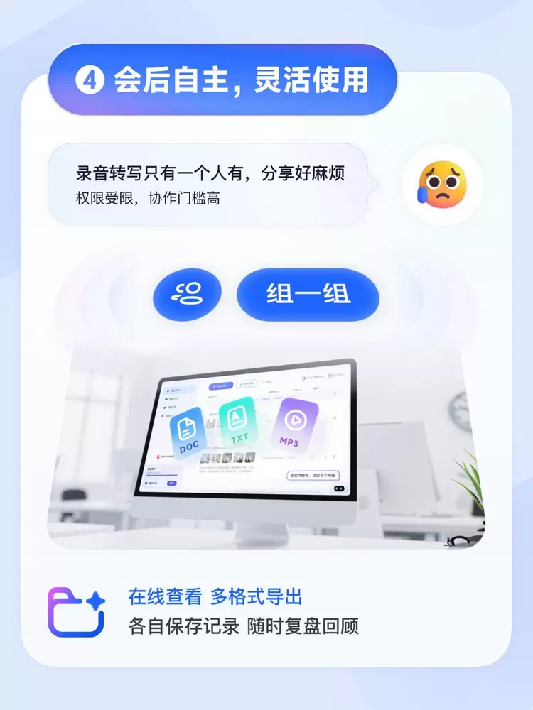 以往录音转写往往只有一个人拥有,分享起来麻烦重重,且权限受限,协作门槛高。通过「组一组」功能加入共享协作,团队成员可各自保存记录,随时复盘回顾,支持在线查看与多格式导出。无论是后续的工作总结,还是信息的二次利用,都能轻松实现,为工作的延续性和灵活性提供了有力保障。