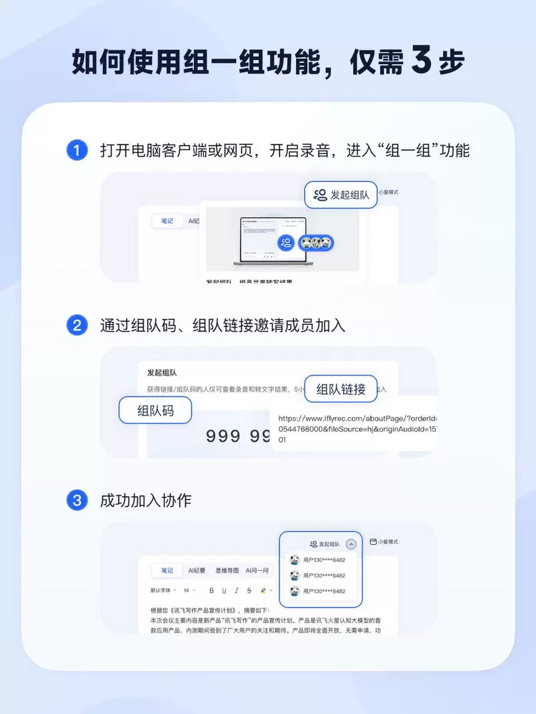 现在,立即登录讯飞听见电脑客户端,开启「组一组」协作新体验,让工作协作更高效、更顺畅!
