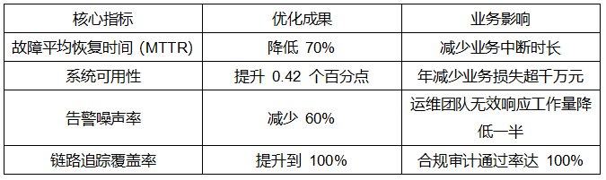 通过全栈观测平台实时采集、全链路校验,并在项目实施的 6 个月内持续监控和优化,充分验证了“可视—维稳—智能”运维模式对金融级云平台的韧性提升和运营效率改进效果。