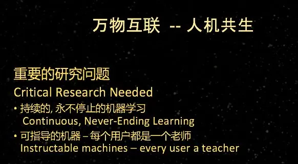 人跟万物互联的时候,比如各种传感器,还有显示、会话界面,很多方面都有一些变化,我们需要研究持续的、永不停止的机器学习。就像自然演化生物不断适应环境一样,AI也需要不断对周围发生的情况作出响应,需要进行持续的学习。