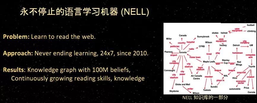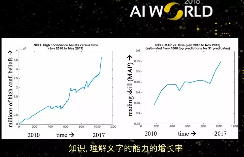 NELL知识库的一部分,上图是机器阅读文字的能力和知识量,随着时间的推移,AI的阅读能力和精度知识都在不停地增长。我们在NELL中获得一些经验以及教训,那就是必须从标记的数据中进行学习,还要优化一致性,让这些语言优化,从而提高我们的准确率。