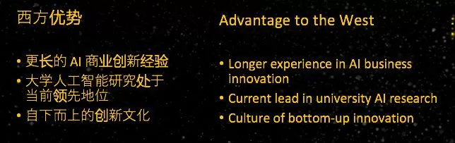 在西方也有一些其它的优势,比如有更长的AI商业创业经验,研究时间比中国悠长一点。目前在西方高校的人工智能研究处于领先,但是西方也有它自己的一些问题。