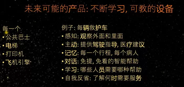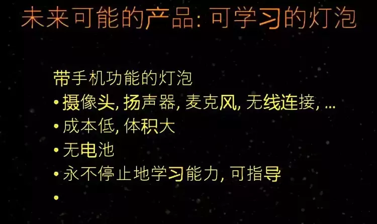 将来还可能会出现能够学习的灯泡,它会带有摄像头,在医院里的灯泡应该学会识别出护士、药品、访客,当病人跌倒了,还要能够识别患者是否需要帮助,它还要与其他传感器联动,对如何帮助病人执行相应的操作。