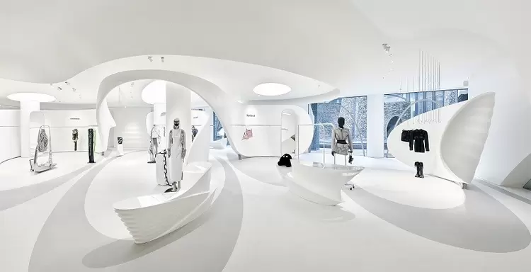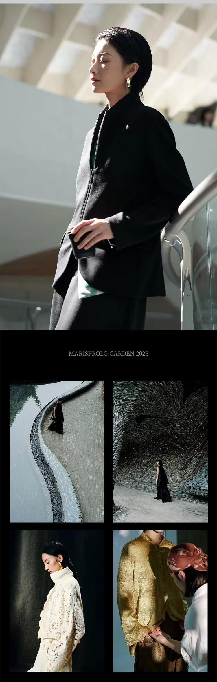在扎哈·哈迪德建筑事务所打造的美学体验空间里,模特身着玛丝菲尔集团2025秋冬新品,自然行走在以蝴蝶为灵感的曲面空间,阳光与建筑结构作为天然背景。