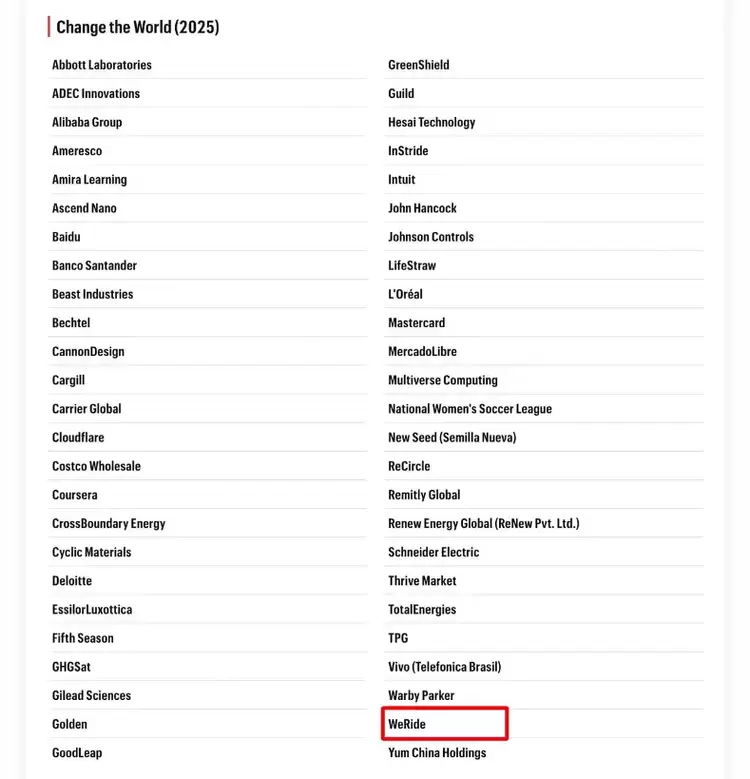 在过去十年里,《财富》“改变世界的公司”榜单始终聚焦那些将创造重大社会或环境价值作为核心战略的企业。作为全球Robotaxi第一股,文远知行凭借持续以自动驾驶技术应对城市生活挑战而入选,彰显了其在推动交通朝着更安全、更智能、更环保的方向发展上的全球领导地位。