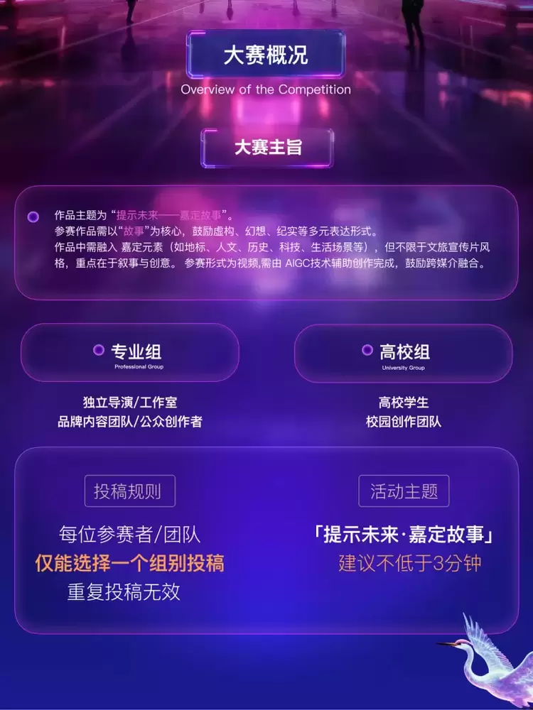 本届「提示未来」AIGC 创作大赛倡导以 AIGC 为引擎、以“故事”为核心,邀请全球创作者将把嘉定的地标、人文与科技活力转化为可被看见的城市故事,促成科技与艺术在城市单元中的深度共创。参赛作品须为 AIGC 辅助完成的视频,鼓励跨媒介工艺,强调表达的新鲜度与文化的触达感,而非“景点拼贴”的宣传片路径。