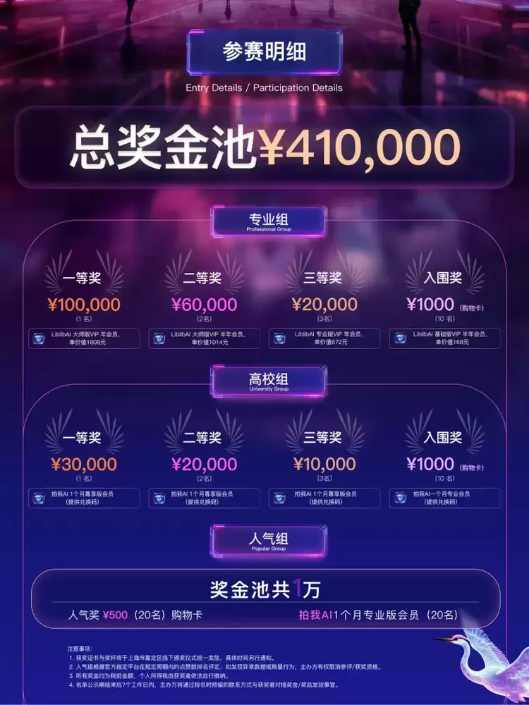 本届AIGC创作大赛设立总奖金池41万元,为获奖作品提供现金奖励及 AIGC 工具订阅等支持,激励创作者在技术与叙事上持续精进与创新。为进一步汇聚“新技术 × 新生代”的创作力量,本届首次开设高校组,面向在校学生与校园创作团队,鼓励跨院系、跨学科协作,以AIGC为创作语言开展影像实践。高校组与专业组同步征片、独立评审,高校组助力课堂创意走向实景,专业组为入围者提供行业深评与资源对接,贯通从培养到应用的一体化路径。