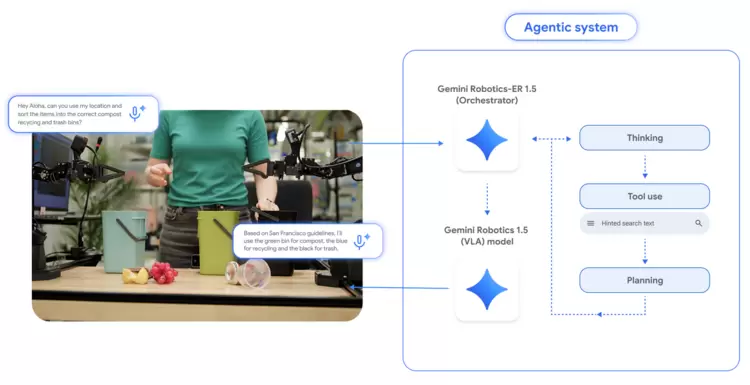 首先,机器人利用升级后的Gemini Robotics-ER 1.5模型感知周围环境,并通过谷歌搜索等数字工具获取更多信息。随后,Gemini Robotics-ER 1.5会将检索结果转化为自然语言指令传递给Gemini Robotics 1.5模型,使机器人能够借助该模型的视觉与语言理解能力逐步执行任务。