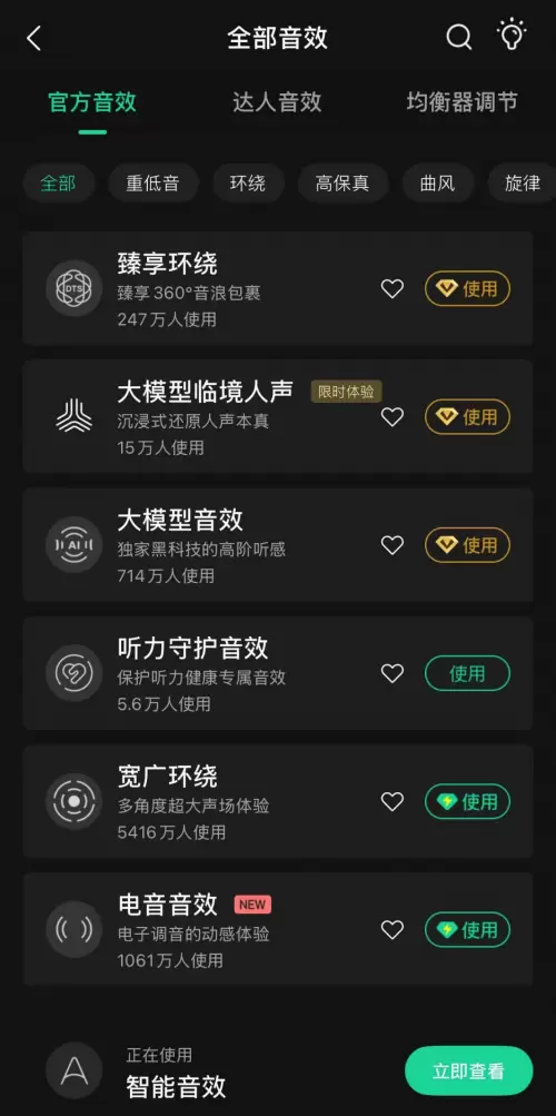 值得一提的是,QQ 音乐已构建起全方位高品质的音质音效听音矩阵:自研的臻品音质、臻品母带、臻品全景声系列及DTS、杜比全景声等;汇聚了包括臻享环绕、宽广环绕、地表ACG等62种联合音效及官方音效。大模型音效凭借独家黑科技带来高阶听感,助眠节拍音效在音乐中添加助眠波适配放松场景,清澈人声音效则更具层次感和穿透力······此外,平台还提供252种达人音效,覆盖虚拟音乐厅、VR旷野、民谣dj、悠扬古风等多元场景,针对不同乐曲风格带来原汁原味的收听体验,全方位满足用户的多样化听音需求。
