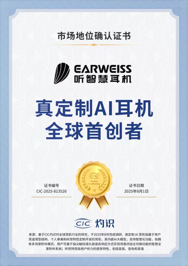 近日,中国深圳的AI耳机创新品牌—听智慧正式收到全球知名咨询机构CIC(China Insights Consultancy)灼识的市场地位确认证书,凭借在AI技术与个性化定制领域的突破性创新,被权威认证为“真定制AI耳机全球首创者”。这一认证不仅是对听智慧耳机技术实力的高度认可,更标志着中国智能可穿戴设备品牌在全球高端耳机赛道实现了从跟跑到领跑的跨越。