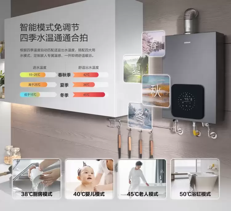 据了解,超算水伺服 AI恒温洗是老板强鼓燃热HD350A的核心“武器”,超算水伺服精准智能控温,智能感温模式能根据四季温度自动匹配适宜出水温度,搭配38℃厨房模式、40℃婴儿模式、45℃老人模式、50℃浴缸模式四大用水模式,为家人定制专属温感。同时,老板强鼓燃热HD350A采用双层密闭稳燃舱,即使天气恶劣,也能让家人随时安心洗个热水澡。