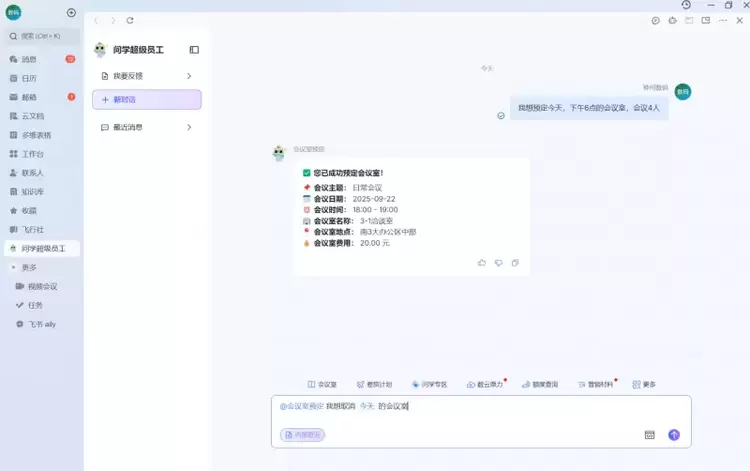 跨系统流程自动化:无缝集成飞书、企微等办公平台,实现差旅、报销、会议等流程自动处理;