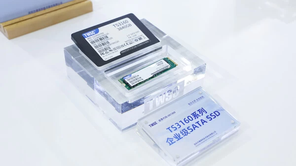 在德明利展位现场,展示了TWSC品牌SATASSD产品,该SATA启动盘专为云服务器基础架构优化设计,具备安全可靠、性能稳定的特点。