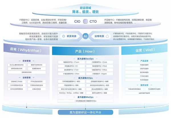 嘉为蓝鲸结合业内先进的腾讯蓝鲸PaaS技术架构、融合嘉为科技20余年研运经验打造的一体化平台,包含:一站式研发效能解决方案DevOps,一体化、平台化、智能化运维解决方案AIOps,一体化智能运维订阅服务WeOps。为客户提供IT研发、运维、运营全领域的产品与解决方案,以科技之力助企业运营更智能!