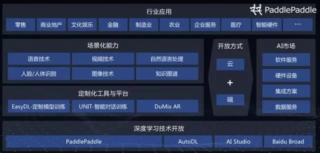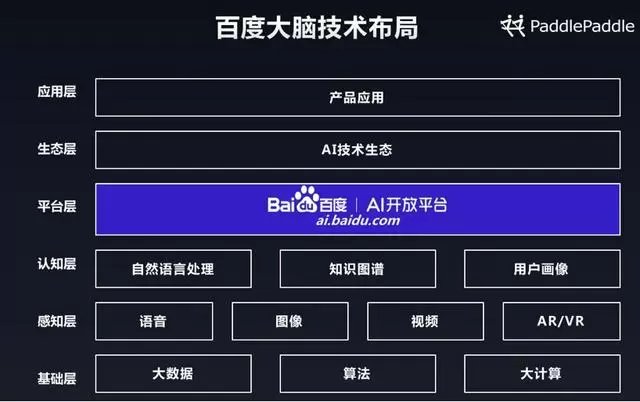 百度大脑覆盖了从数据、算法、计算到感知层、认知层、平台层、生态层、应用层的不同能力层面的技术布局,其中平台层对外开放,生态层对接合作伙伴、开发者,最后在应用层落地企业、行业应用。