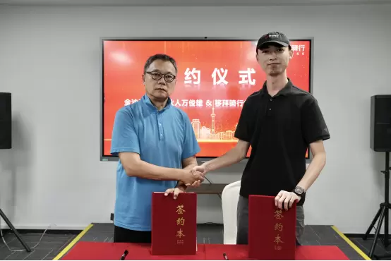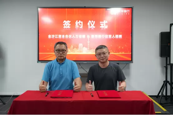 (图为金沙江资本合伙人与移拜骑行创始人严建东于签约仪式现场)