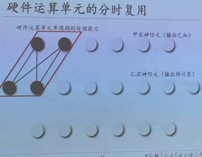 硬件运算单元的分时复用(虚拟化)示意图如下图所示。一个硬件运算单元如果每次能够处理两处,针对图中所示网络,需要完成在不同时刻载入所需数据,或计算不同的输出神经元,然后通过往返复用,从而最完成整个网络的运算。