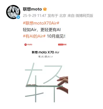 主打轻薄与AI!联想moto X70 Air正式官宣,10月底发布