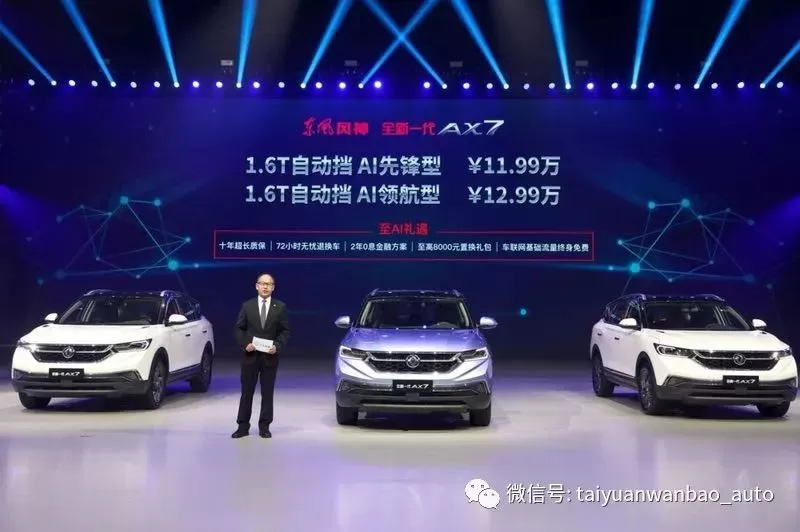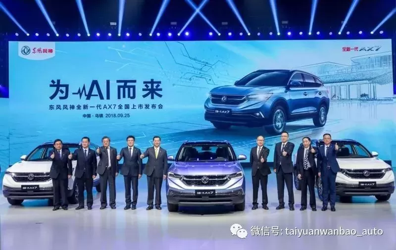2018年9月25日,东风风神全新一代AX7在乌镇互联网国际会展中心正式上市。应互联网时代之势,以人工智能之名,全新一代AX7为AI而来,集智能车机AI生态、大气外观交互美学、丰富配置越级享受于一身,开启智慧出行新时代。全新一代AX7此次上市共推出AI先锋型、AI领航型两个规格,市场建议价分别为11.99万元-12.99万元。