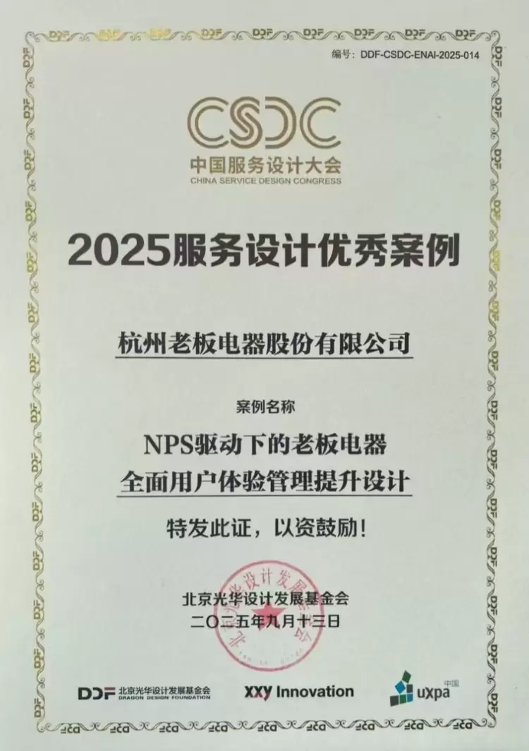 在近日由商务部服贸司主办的第八届中国服务设计大会上,老板电器凭借其独具特色的“全面用户体验管理暨NPS体系”荣获优秀案例奖,与科大讯飞、飞利浦等国际知名品牌同台获评。这一荣誉标志着老板电器在用户体验领域的创新实践获得国家层面的权威认可,其“以用户为中心”的服务理念已走在行业前列。