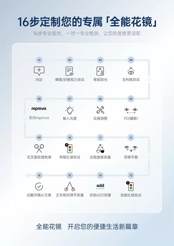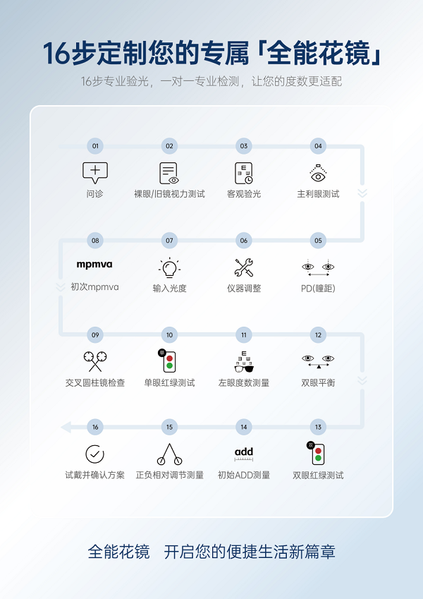 为了确保此类镜片的精准适配,博士眼镜引入了 【16步专业验光流程】。该流程升级了基础度数测量,验光师结合用户原有的屈光状态,进行包括精准瞳距与瞳高测量、双眼平衡、用眼场景模拟等在内的系统性检测与个性化调整,全程由持有国家认证的专业验光师执行。