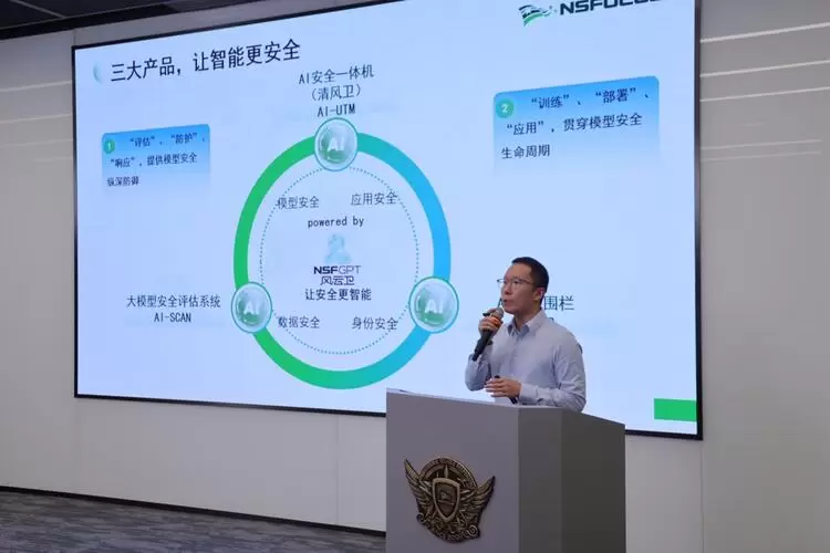 绿盟科技AI安全产品经理李斌介绍了绿盟三大AI安全产品。他表示:面对大模型应用带来的全新安全挑战,绿盟科技正式发布三款核心产品,构建“评估-防护-响应”的全生命周期防御体系。