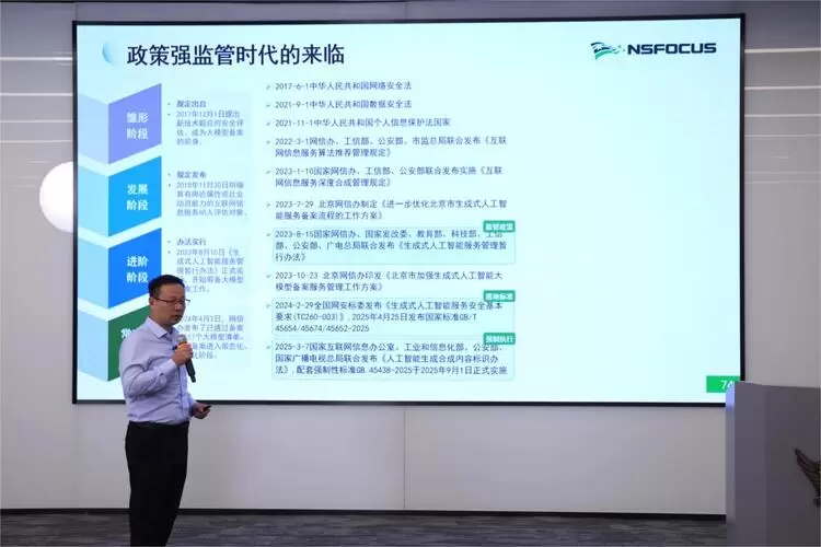 绿盟科技资深总师胡斌介绍了大模型安全评估备案服务。他表示:随着大模型技术的爆发,2023年8月《生成式人工智能服务管理暂行办法》正式实施,标志着我国生成式AI监管进入有法可依的“进阶阶段”,备案工作全面启动。截至2025年8月底,全国已完成算法备案3834项,这是人工智能合规发展的第一道防线。大模型上线需履行备案程序,由属地网信办进行初审,再报至国家网信办完成终审。模型备案已成为大模型合规上市的关键环节,全国已有491个大模型成功备案。在产品层面,北京等地率先推行“大模型产品登记”机制,仅北京一地的登记数量就已达144项。