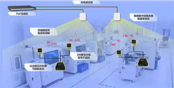 部署PoF交换机和AP,两者之间采用光电复合缆实现通讯和传输,完成无线局域网覆盖。SPI、AOI等设备部署工业网关,将传统网线连接方式变为无线连接,实现车间“剪辫子”。产线调整时不用重新布线,直接移动设备即可,大幅度提高组网灵活性,适配电子行业柔性生产趋势。