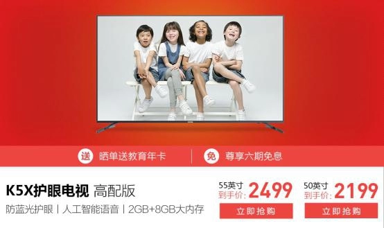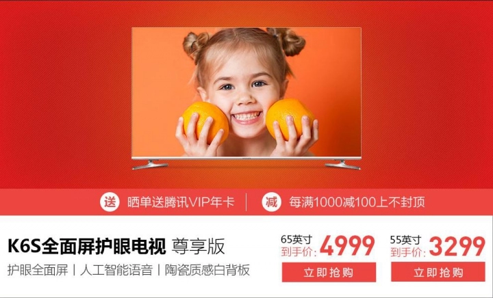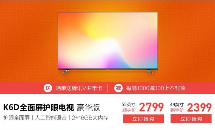 酷开K6D电视活动中同样享受满千减百上不封顶优惠,晒单可获赠腾讯VIP年卡。酷开55K6D优惠价2799元,酷开49K6D优惠价2399元。酷开K6D不仅是一款全面屏护眼电视,更是一款教育电视。