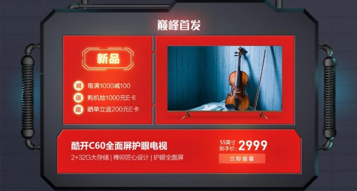 酷开C60是酷开九月发布的新品电视,这款电视将古典艺术与创新设计相结合,兼具颜值和实力。本次巅峰24小时活动,每满1000元减100元,购机可抽取1000元E卡,晒单立返200元E卡。