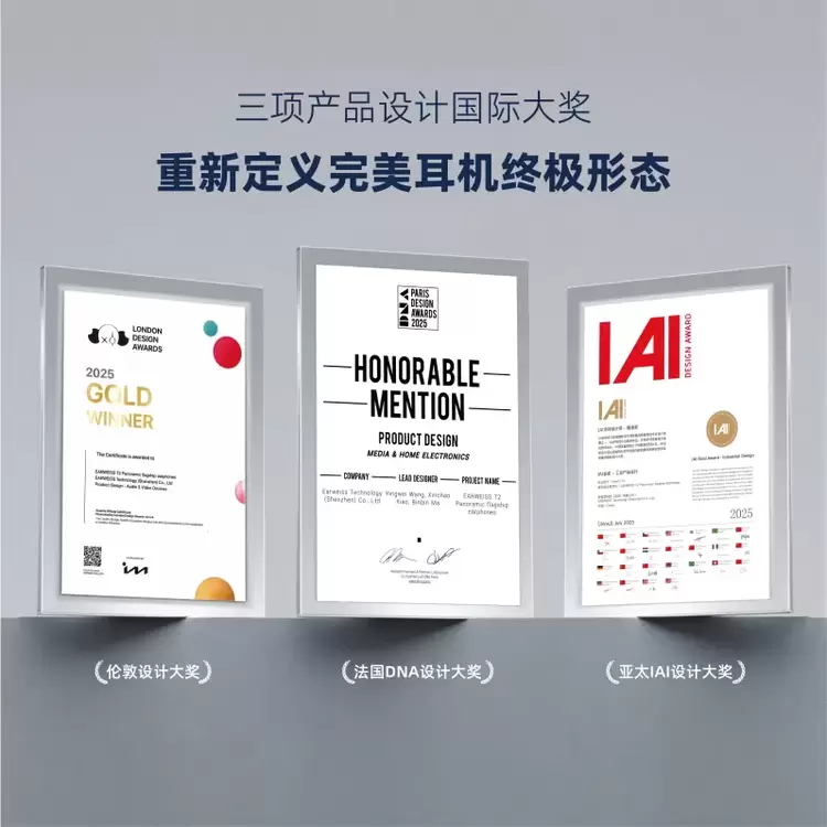 近日,中国AI耳机创新品牌听智慧科技(EARWEISS)传来捷报,旗下旗舰产品EARWEISS T2真定制全景AI耳机凭借在工业设计与技术创新的深度融合,一举摘得伦敦产品设计金奖(London Design Awards Gold)、IAI产品设计金奖(IAI Design Award Gold)、法国DNA产品设计金奖(DNA Paris Design Award Gold)三项国际设计领域权威荣誉。作为同时斩获这三大奖项的中国AI耳机品牌,EARWEISS T2以高科技定制首次勾勒出“完美耳机终极形态”的技术蓝图,重新定义耳机新体验。