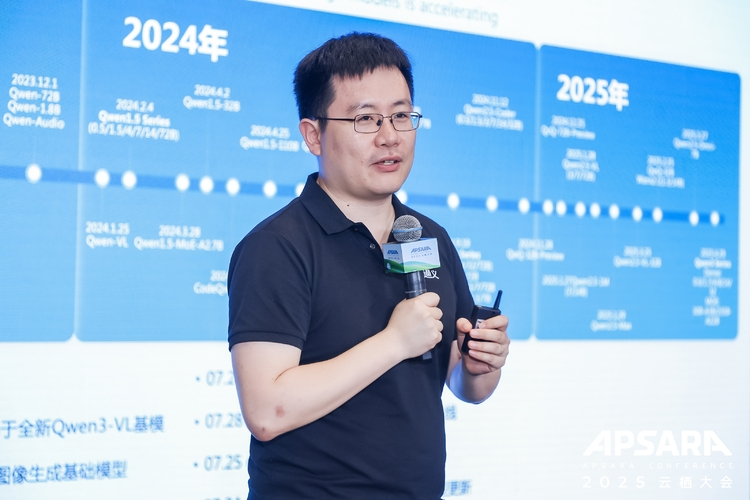 从时间线来看,通义家族的进化速度与广度,远超行业平均水平:2023年4月通义千问初代发布,仅支持基础文本任务;2024年进入多模态爆发期,Qwen-VL、Qwen-Audio、Wan相继落地;2025年则迎来全栈升级,在云栖大会首日主论坛发布7款覆盖语言、语音、视觉、多模态领域的大模型新品。