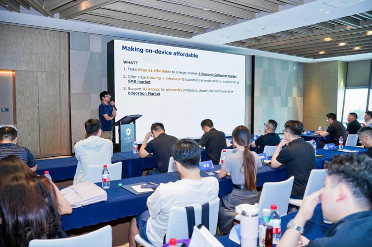 AI 赋能各行各业,不仅需要强大的算力支持,更需要整个生态协同一起加速 AI 产业应用落地。群联集团厦门佳芯电子有限公司总经理刘安城详细介绍了aiDAPTIV + 解决方案,无需破坏性加装,仅需按常规规格插入 SSD 并搭配中间件,即可实现 “扩展 GPU 内存”,让Mini AI工作站有了成为训推一体的可能,并且有效解决 KV Cache 数据丢弃问题,Demo 显示,搭配方案回答 5 个问题耗时不到 1 分钟,传统方案需 4 分钟。这一技术与 SEAVIV 产品的结合,不仅打破了 AI 部署的硬件壁垒,还让SEAVIV的MiniAI工作站有了更多的商业落地场景,进一步降低了中小企业、教育机构等的 AI 部署门槛,推动大语言模型从 “助手” 升级为能解决实际问题的 “顾问”。
