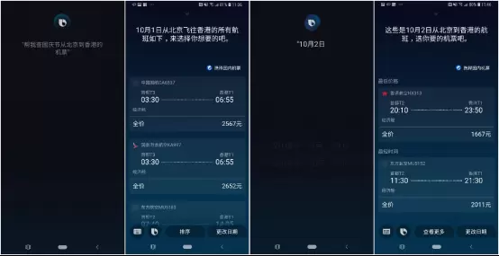 首先,我向Bixby下达语音指令:“帮我订一张国庆节从北京到香港的机票”,Bixby马上识别出了国庆节是10月1日,并且按照价格由低到高的默认设置展示了当天的所有机票。但是当天最低票价都高达2600元,于是我在页面下方选择更改日期,告诉Bixby我要10月2日出发,于是Bixby再次为我推荐了第二天的机票。