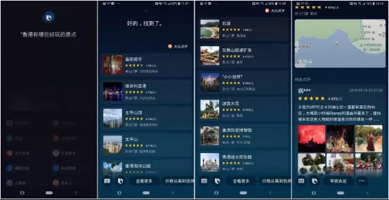订好机票后,我需要进一步制定当地的行程安排,于是我问Bixby:”香港有哪些好玩的景点?”Bixby迅速帮我列出了一些景点。因为我无法判断哪些景点最值得玩,于是我进一步询问:“按照好评度由高到低排序”,Bixby迅速理解了我的语义,并且帮我筛选出了一批五星好评的旅游胜地。经过Bixby的推荐,我选择香港迪士尼乐园和海洋公园作为我此行的两站目的地。点开目的地介绍,还可以看到交通路线和网友的晒图评论,让我的攻略更加全面。