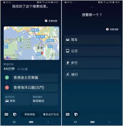 最后,我不清楚这两个目的地距离有多远,于是我再次请求Bixby的帮助。Bixby通过内部集成的百度地图为我规划了行车路线,如果点击更多出行方式按钮,还可以选择公关交通出行,十分贴心。