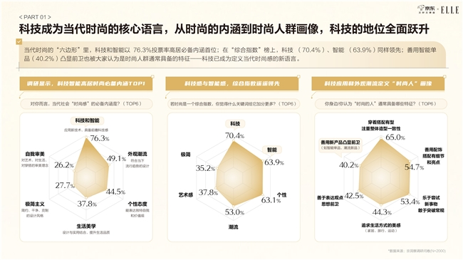 在这一背景下,科技和智能的地位实现了从外延到内涵的跃升。调研结果显示,在“当代时尚六边形”构成中,“科技”与“智能”以76.3%的投票率高居“必备内涵”首位;在“时尚综合指数”榜单中,“科技”以70.4%、“智能”以63.9%同样领先。此外,40.2%的受访者认为“时尚的人”应当善于使用智能单品来凸显前卫感。科技所承载的不再是冰冷的功能属性,而是塑造审美、定义风格的重要工具。