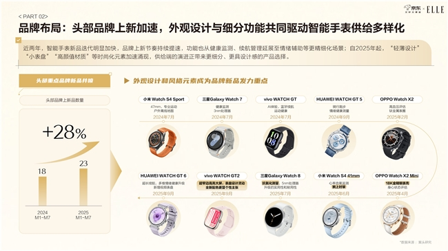 供给侧的演进则进一步推动了市场活力的释放。近两年,头部品牌的新品节奏显著加快,2025年前七个月头部品牌新品数量同比增长28%。在竞争加剧和消费需求不断细分的背景下,品牌正以“设计创新”为核心路径,推动智能手表从“科技设备”向“时尚单品”转变。