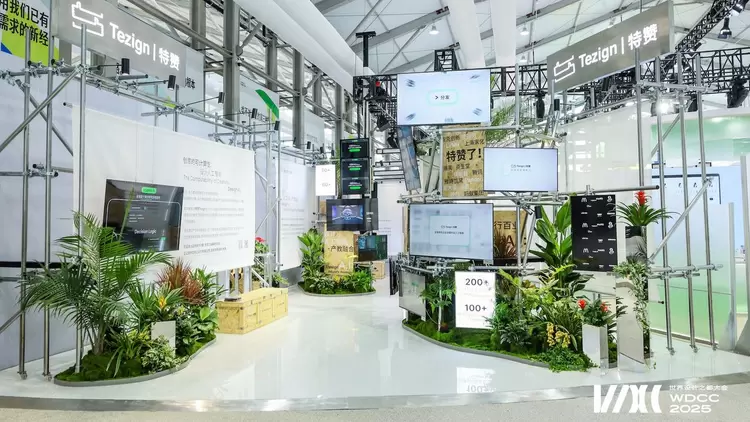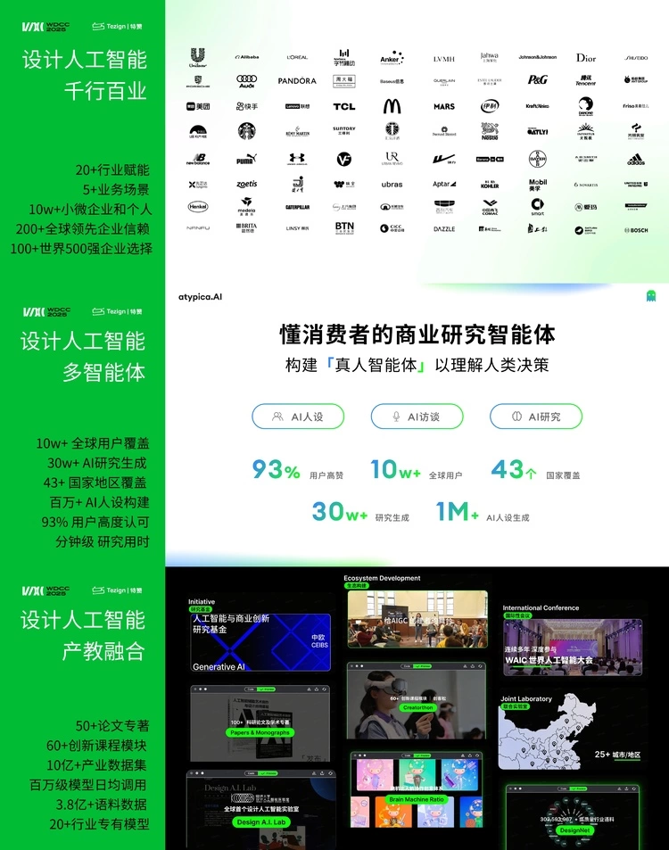 在 WDCC2025,特赞展览分为三大主题空间,讲述“计算×创意”如何推动设计生命力延展。所有展具采用环保材料搭建,“数字之树”与动态屏幕象征着设计在科技与环境之间的共生与生长。在“设计人工智能・千行百业”板块,展现设计人工智能跨越产业边界,在多行业实现赋能,以特赞在各行业最佳实践诠释可计算创意驱动产业发展;在 “设计人工智能・产教融合”板块,聚焦设计人工智能打破学科边界、推动产学研协作,以同济 x 特赞设计人工智能实验室创新实践为核心,构建创新教育生态;在“设计人工智能・多智能体”板块,聚焦重构人机协作模式,以开创新的商业研究多智能体 atypica.AI 为核心,展示其为商业研究提供智能化新模式。
