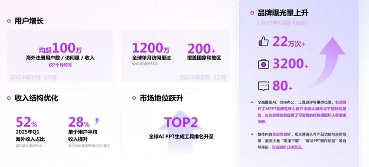 这一系列举措带来的不仅是用户增长的加速,更是商业价值的跃升。到2025年初,AIPPT在全球的单月访问量已达到1200万,海外收入占比首次超越国内,企业客户的平均付费水平提升28%,验证了其在高端市场的溢价能力。借助技术与营销的双向驱动,AIPPT不仅在激烈的AI办公赛道中突围,更以出海案例的形式,为行业提供了可量化、可复制的增长范式。