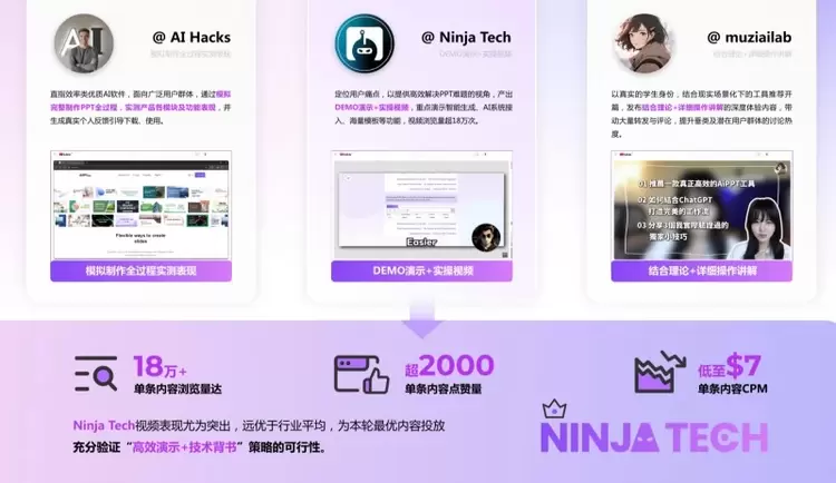 在具体打法上,AIPPT充分利用搜索广告的分层策略,精准覆盖“AI PPT generator”“free AI presentation maker”等高意向人群,平均点击成本降低20%以上。同时,通过教育、职场等高频应用场景定制广告素材,CTR提升25%,显著提高了转化效率。更值得一提的是,AIPPT在内容营销上深耕YouTube和X平台,与效率办公类、AI工具测评类红人合作,以真实体验和场景化演示构建信任。尤其是与创作者Ninja Tech的合作视频单条浏览量突破18万次,点赞超2000,带来远高于行业平均的投放回报,也让AIPPT品牌迅速在核心市场中建立起认知与口碑。