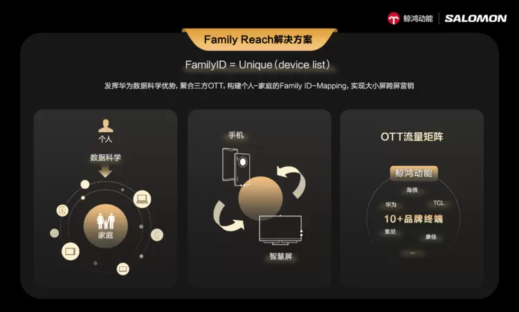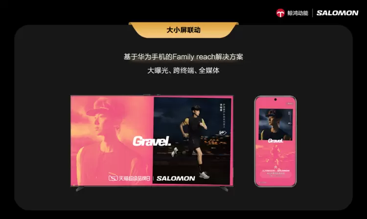 在碎片化的媒介营销环境中,品牌如何在家庭场景中“抓住”用户,深挖“客厅经济”的消费潜力并实现确定性增长?9月22日,基于鸿蒙生态的全场景智慧营销平台——鲸鸿动能与户外高端品牌SALOMON携手打造的首单家庭场景广告案例正式上线,截至目前,该案例广告在鲸鸿动能平台上的累计曝光量已近千万次,此举标志着鲸鸿动能的家庭场景化解决方案“Family Reach”(以下简称“Family Reach”)全面启动商用。