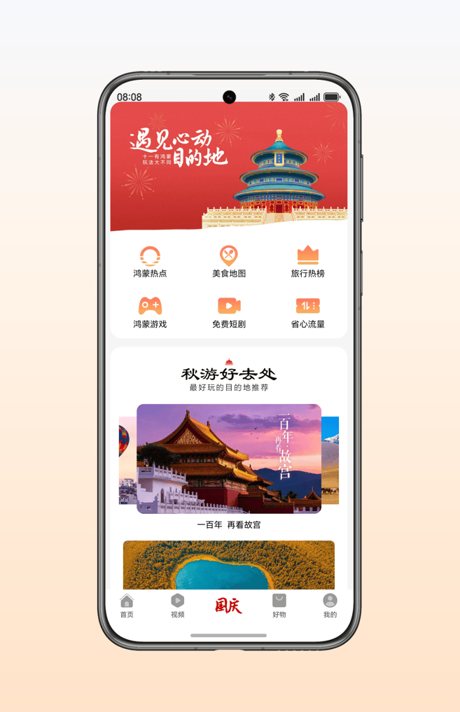 “遇见心动目的地”频道是为用户打造的旅行资讯阵地,将假期热门旅游资讯集合一处,方便用户获取出游资讯并做旅行好攻略。此次国庆“十一有鸿蒙,玩法大不同”专题,就收录了丰富的旅游资讯,整合本土人文、旅游路线、特色景点攻略等权威信息,让你出发前先“云游”解馋。