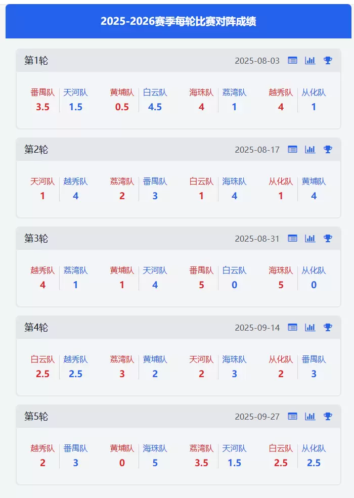 第5轮对阵:白云队 VS从化队,越秀队VS番禺队,荔湾队VS天河队,黄埔队VS海珠队。